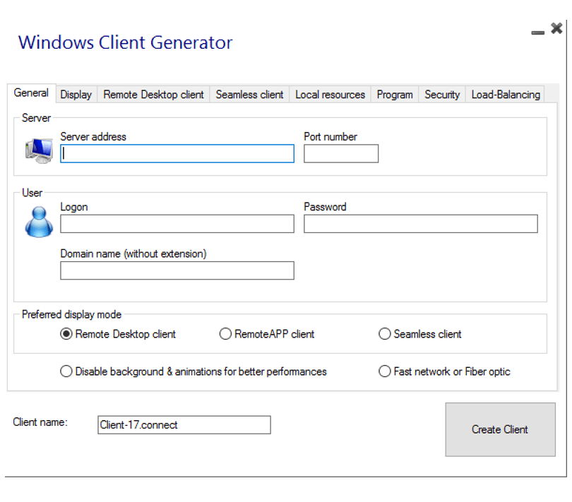 The generated client is a .connect from the client generator installed on the Jet Clouding server. The final user does not have to remember his customized parameters anymore; a simple click on the generated client program and he is connected to his remote server.